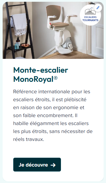 Pour un escalier tournant, en colimaçon ou étroit, optez pour un fauteuil monte-escalier courbe. L’élévateur Ivory® s’adapte à toutes les formes, tandis que le MonoRoyal® est idéal pour les escaliers exigus.